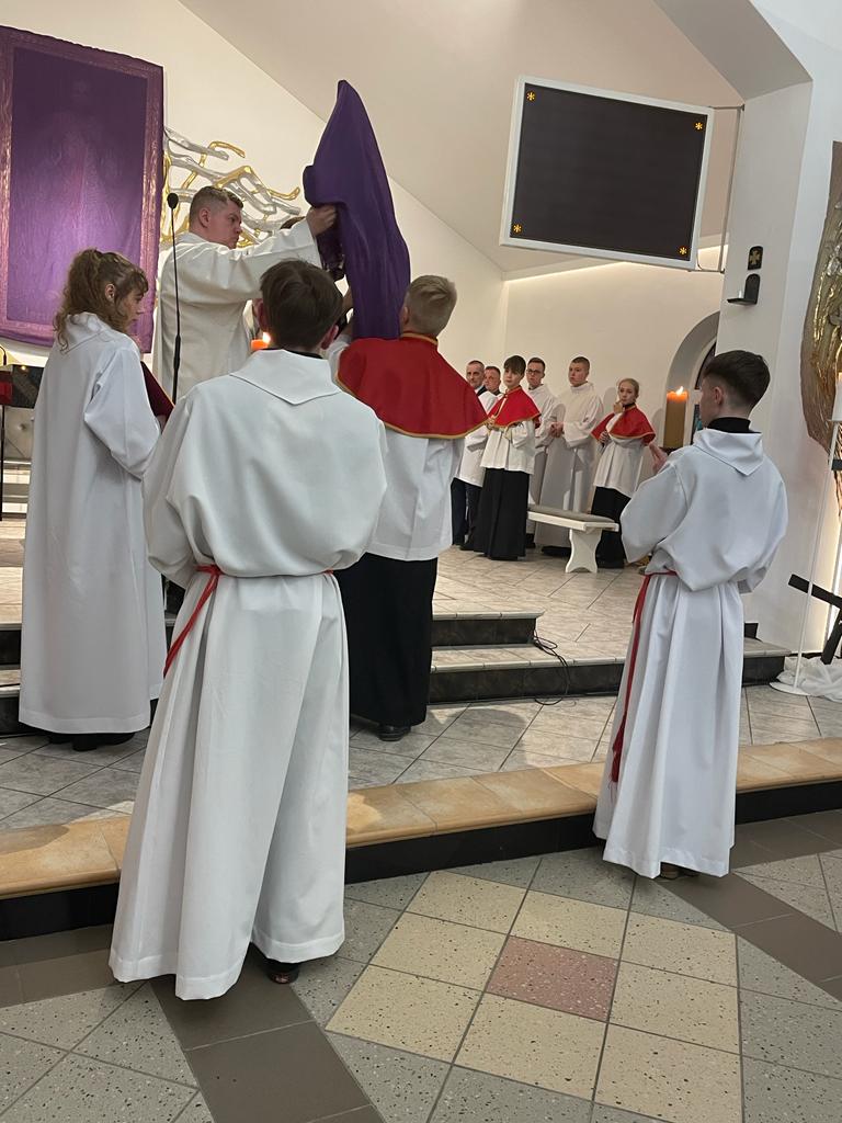 Po Liturgii Słowa nastąpiła adoracja krzyża, rozpoczęta uroczystym odsłonięciem naszego znaku zbawienia. Wierni oddawali cześć krzyżowi przez ukłon.